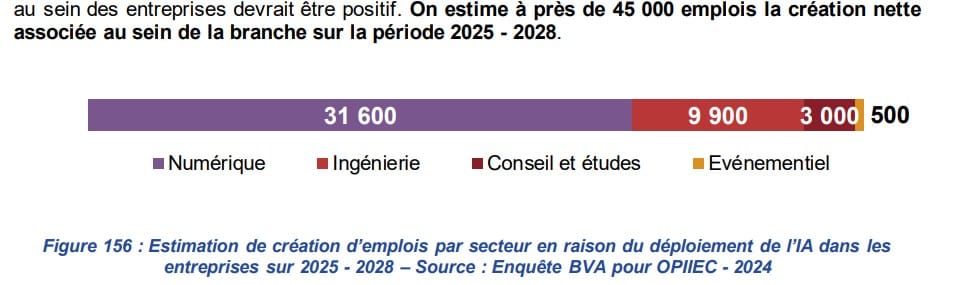 - L’IA n’est pas seulement destructrice d’emplois : le solde net est attendu positif avec près de 45 000 créations d’ici 2028 dans les secteurs de la branche (numérique, ingénierie, conseil, événementiel).