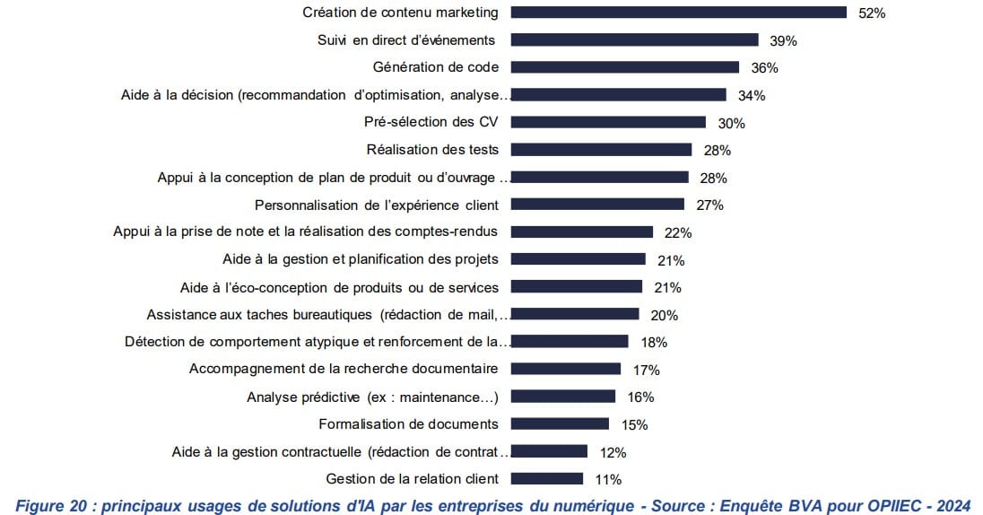 - Conseil : usage varié (création de contenu marketing, prise de notes, gestion contractuelle, relation client, pré-sélection de CV). Près de 3 000 emplois pourraient être créés d’ici 3 ans, surtout en management, développement et pilotage de projets.