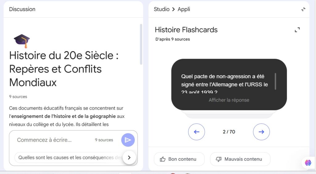 La grande star de cette mise à jour, ce sont les quiz interactifs et fiches de révision automatiques ! J’ai testé cette fonctionnalité et c’est tout simplement bluffant. Il suffit d’importer vos documents – notes de cours, rapports, articles scientifiques – et pouf ! NotebookLM génère automatiquement des questionnaires à choix multiples personnalisés.