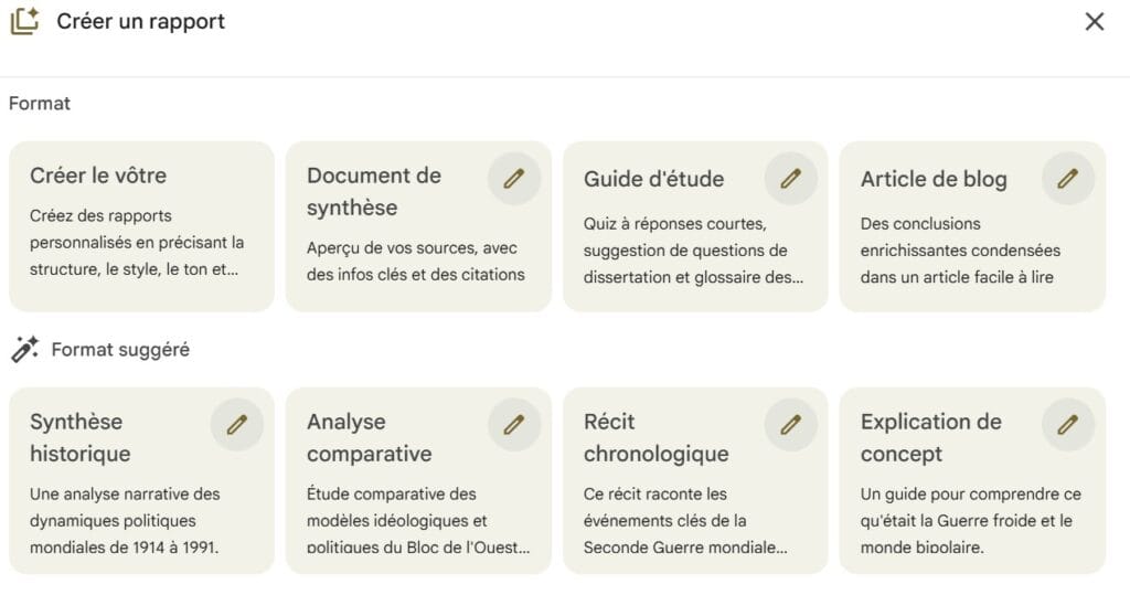 NotebookLM ne se contente plus de générer des résumés basiques. Désormais, l’IA suggère dynamiquement les formats les plus pertinents selon votre contenu :