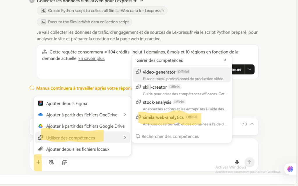2️⃣ Utiser le + du chatBot > Comptence > similarweb-analitics