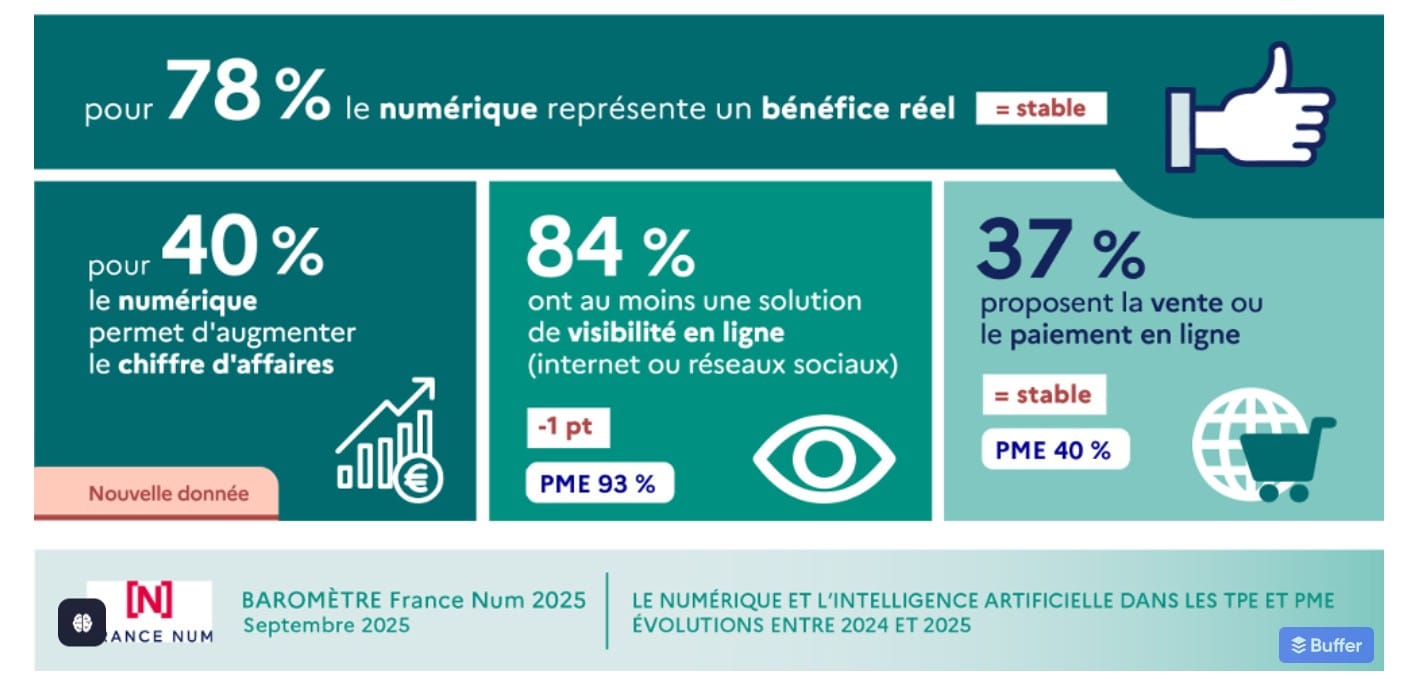 PME1 2 mois ago0 min0 Résumer avec : ChatGPT Grok Perplexity Claude marietteleguellaff Navigation de l’article Baromètre France Num 2025 : l’IA progresse vite dans les TPE-PME, mais la maturité reste fragile Laisser un commentaire Annuler la réponseVotre adresse e-mail ne sera pas publiée. Les champs obligatoires sont indiqués avec *Commentaire * Nom * E-mail * Site web Enregistrer mon nom, mon e-mail et mon site dans le navigateur pour mon prochain commentaire.