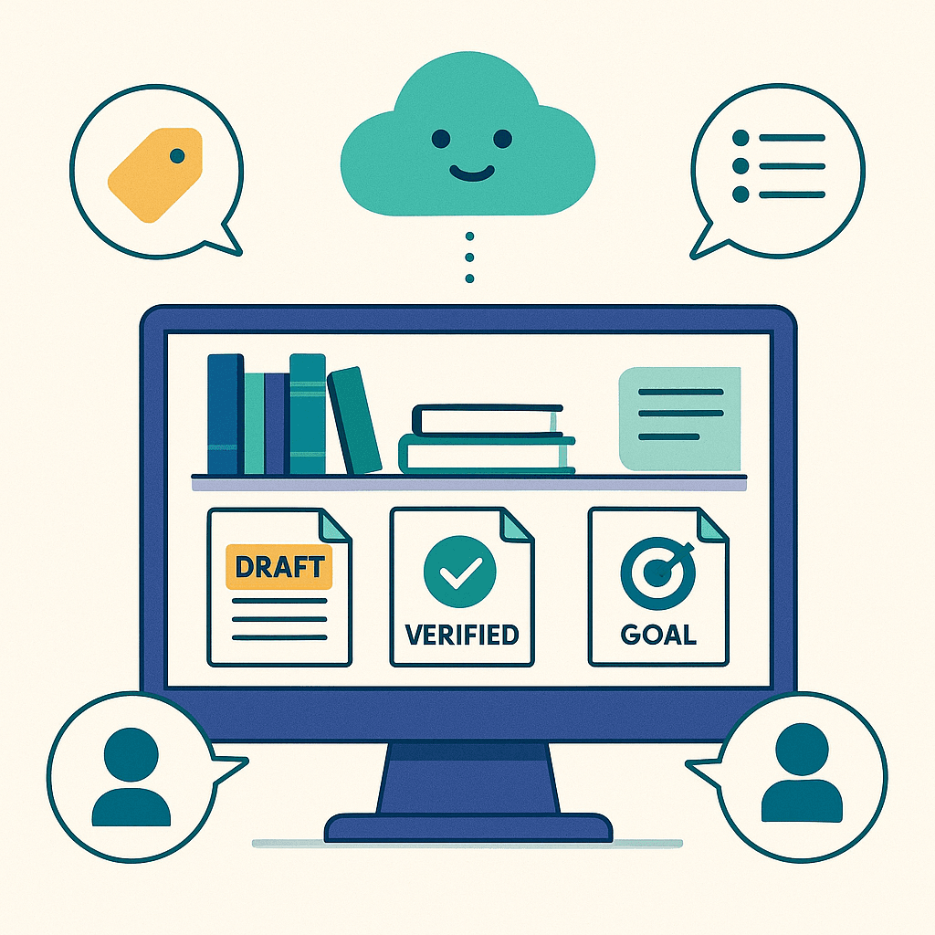 - Ajouter des propriétaires, des étiquettes (tags) et des statuts clairs (comme « brouillon » ou « vérifié ») aux documents de travail.