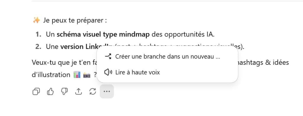 La fonctionnalité la plus récente permet de créer des branches dans les conversations. Cette nouveauté très demandée offre la possibilité d’explorer plusieurs pistes de dialogue sans perdre le fil principal de la discussion